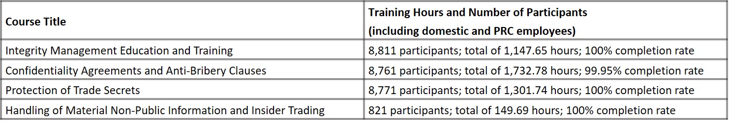 New employees are required to complete corporate social responsibility training upon onboarding, which includes promotion of integrity and ethical business conduct requirements. In 2025, the completion rate of this training reached 100%. The Company also provides periodic training for existing employees or arranges external training opportunities to continuously strengthen and reinforce ethical and integrity-based conduct.