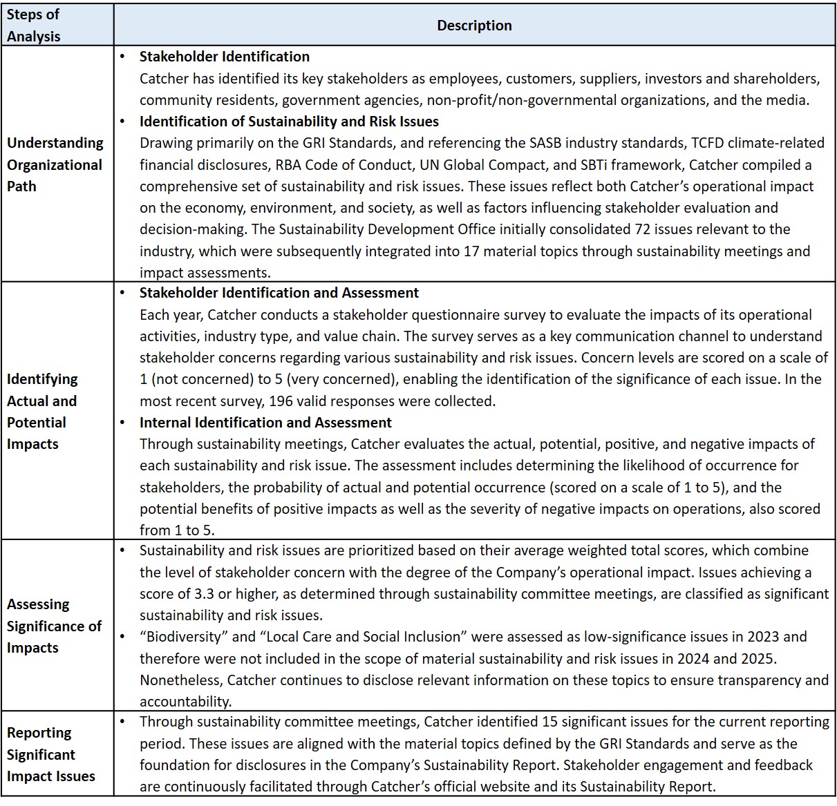 *Biodiversity and Local Care and Social Inclusion were assessed as low-significance issues in 2023 and, therefore, were not included within the scope of material sustainability and risk issues in 2024 and 2025. Nonetheless, Catcher continues to disclose relevant information on these topics to ensure transparency and demonstrate its ongoing commitment to environmental protection and community engagement.