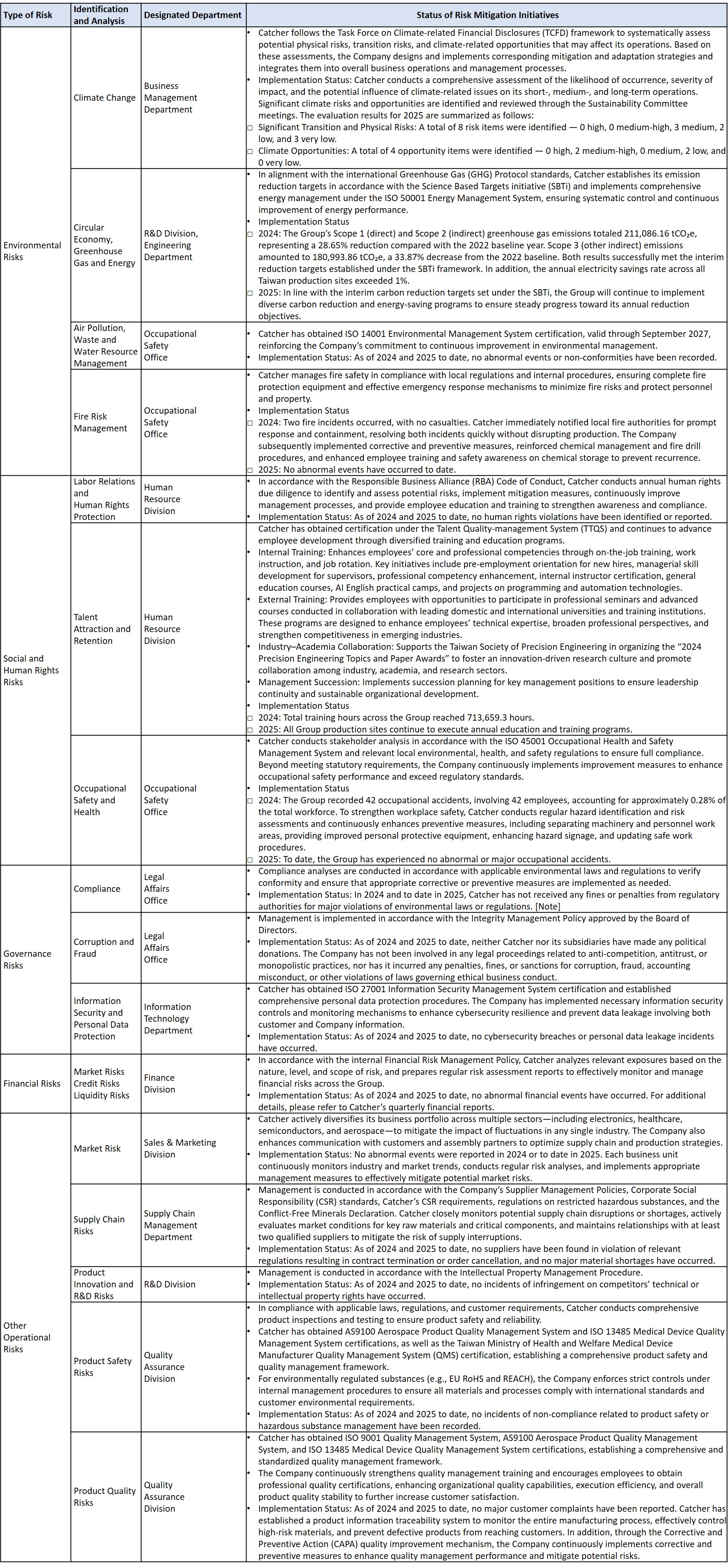 Catcher actively implements its risk management system and continuously strengthens the identification, assessment, and control of various risks. On November 6, 2025, the Sustainability Development Office presented the annual report on the Company’s risk management operations to the Audit Committee and the Board of Directors. The key highlights are summarized as follows: