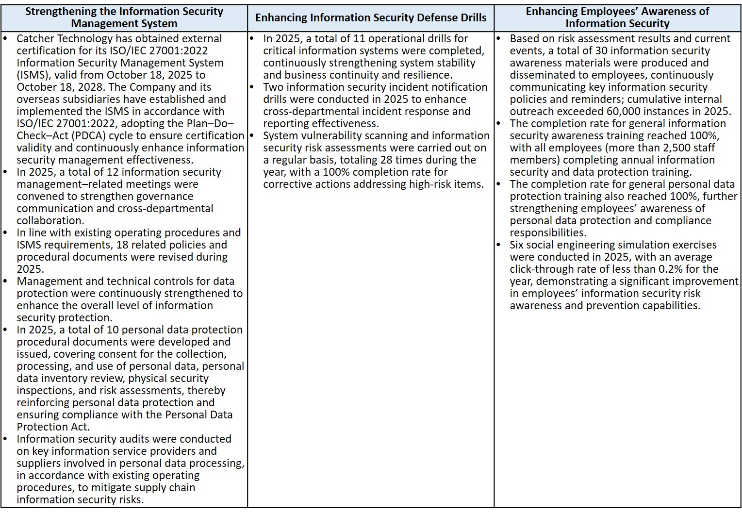 Catcher Technology is committed to information security management. Through comprehensive management systems and technical controls, the Company safeguards its products, services and information assets, prevents unauthorized access, alteration, use and disclosure, and mitigates potential losses arising from natural disasters and other unforeseen incidents. The Company ensures the timeliness, integrity and availability of information to protect the confidentiality, integrity and availability of critical information assets, while complying with applicable laws and regulations. These efforts are aimed at strengthening customer trust, fulfilling commitments to shareholders, and ensuring the continuity of critical operations and the Company’s sustainable development.