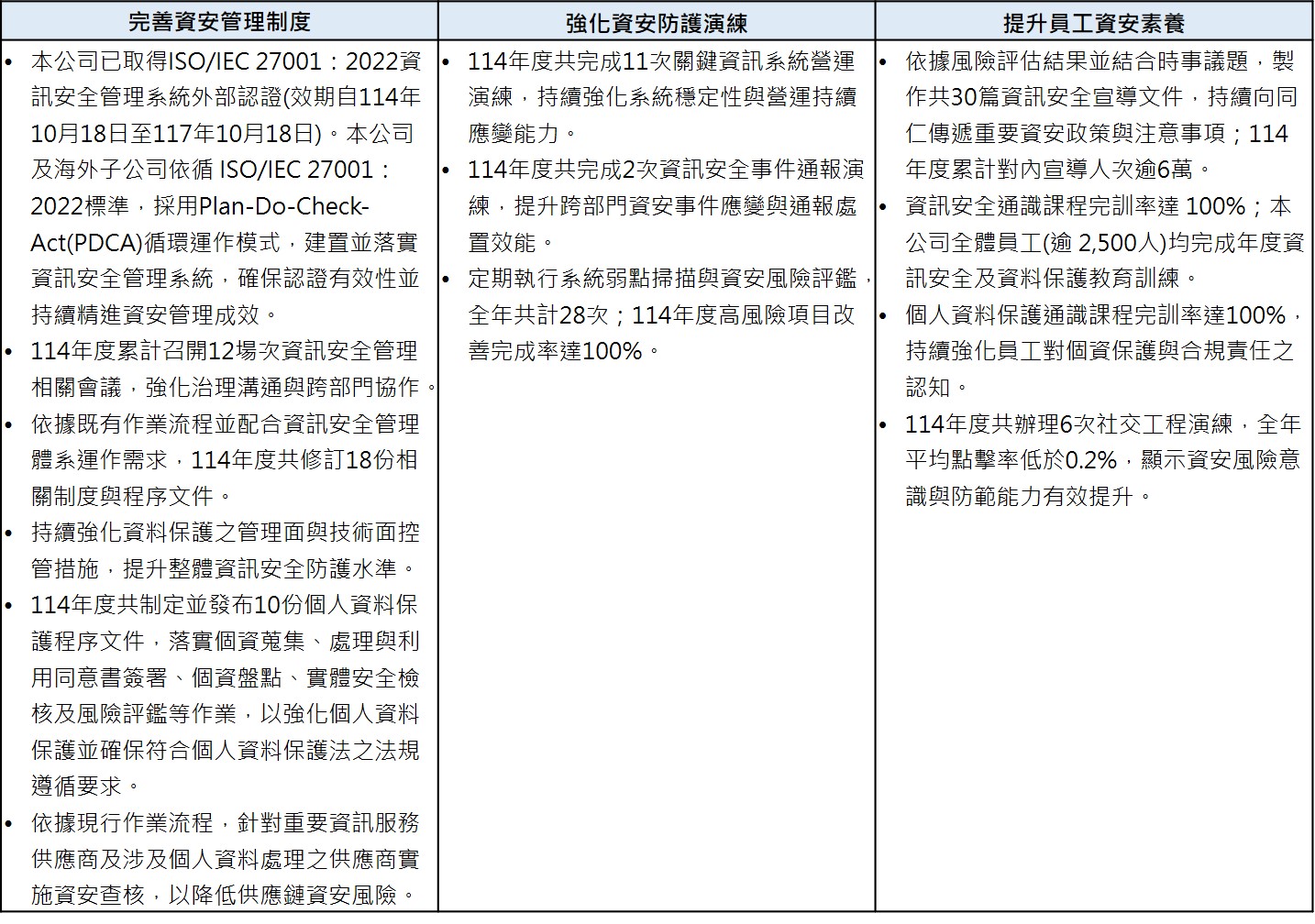 為展現本公司貫徹資訊安全管理之決心,並確保所有資訊資產與資訊系統均獲得適當保護,本公司依循ISO/IEC 27001:2022標準,建置、記載、實施及維護資訊安全管理系統,並透過持續改善機制,不斷提升系統運作之有效性。